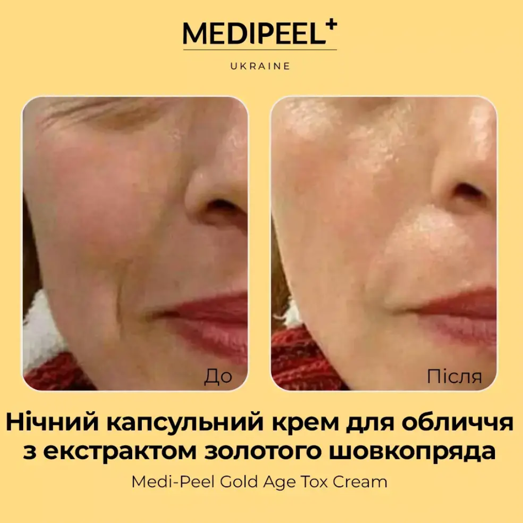 Medi-Peel Gold Age Tox Cream із золотим шовкопрядом - ваш секрет омолодження шкіри! Випробуйте неймовірну пружність, щільність і зволоження, гладкість зморшок, а також поліпшення тону в обличчі.