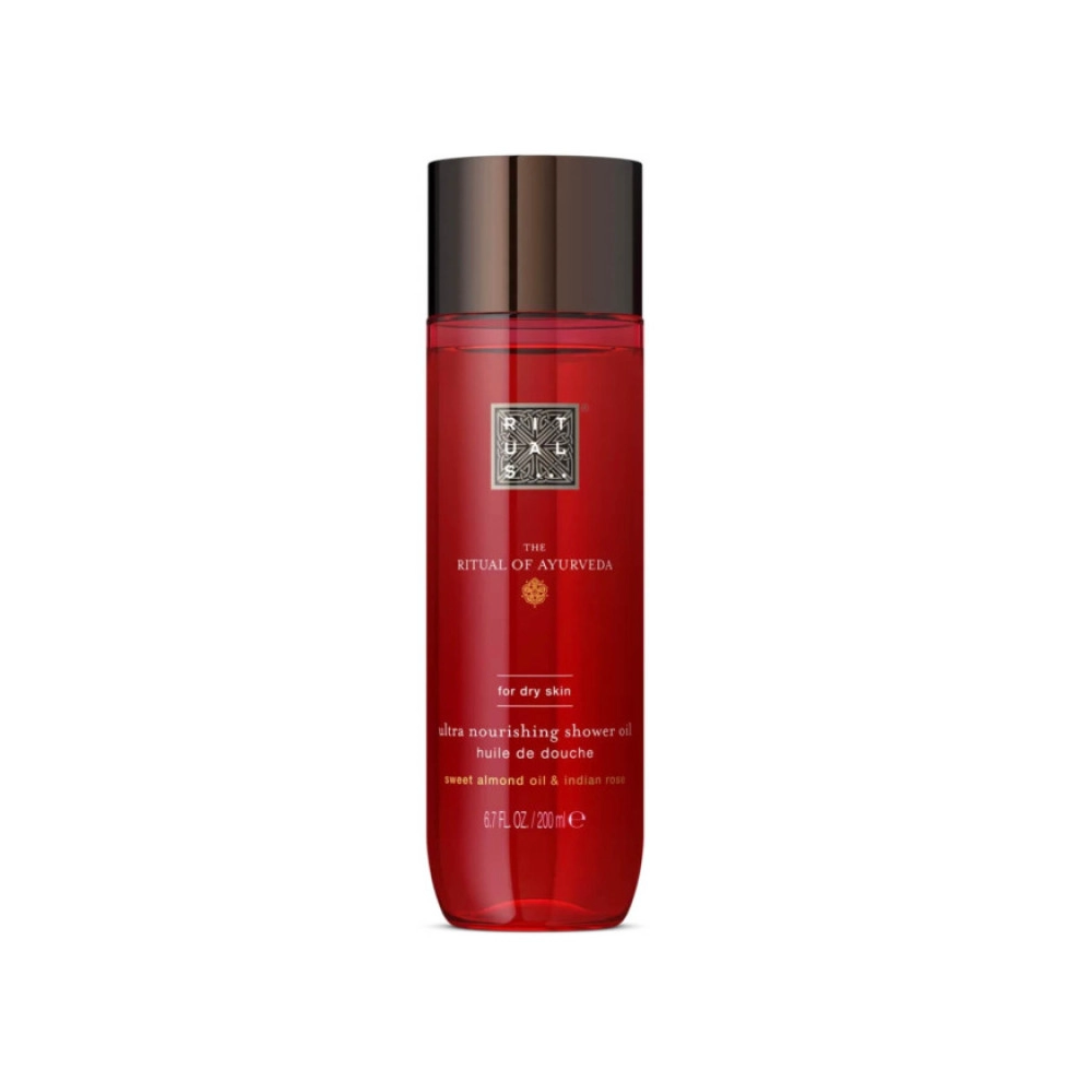 Олія для душу Rituals The Ritual of Ayurveda (Нідерланди) – косметика для очищення тіла на рослинній основі. Засіб з'єднавшись з водою перетворюється на густу піну, ніжно видаляє забруднення, пил та неприємні запахи тіла. Поживні олії зберігають баланс шкіри тіла, наповнюють клітини вологою, живлять і захищають від сухості. Екстракти індійської троянди та солодкого мигдалю насичують корисними компонентами епідерміс, повертають пружність, м'якість та шовковистість, відновлюють водний баланс. При регулярному застосуванні олії для душу зникне сухість, лущення та свербіння. Шкіра стане м'якою, бархатистою та пружною. Повернеться еластичність, гладкість і здорове сяйво, а протягом усього дня супроводжуватиме запах ароматної троянди та мигдалю.
