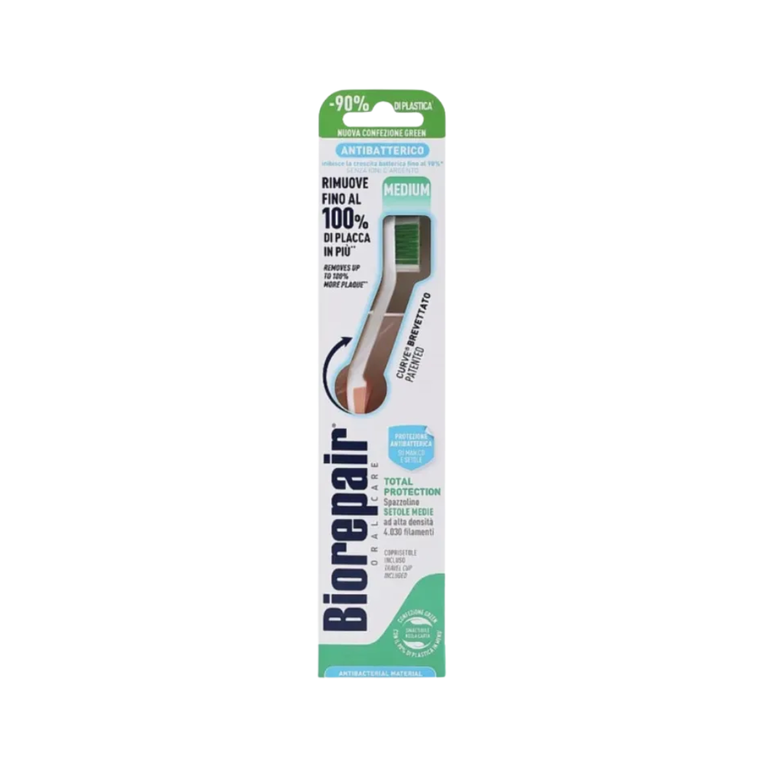 Зубна щітка Biorepair Medium забезпечує ефективний та безпечний щоденний догляд за ротовою порожниною. Завдяки запатентованій технології Biorepair CURVACTIVE із вигином під кутом 210°, вона допомагає уникати надмірного тиску на зуби та ясна, водночас забезпечуючи точний контакт з поверхнею зубів.
